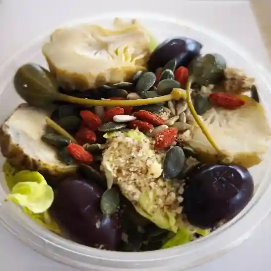 Green Salad, Grilled Chicken kimchee, Carrot, Parmesan Vegetable, raisin, sunflower seed, tomato, olives