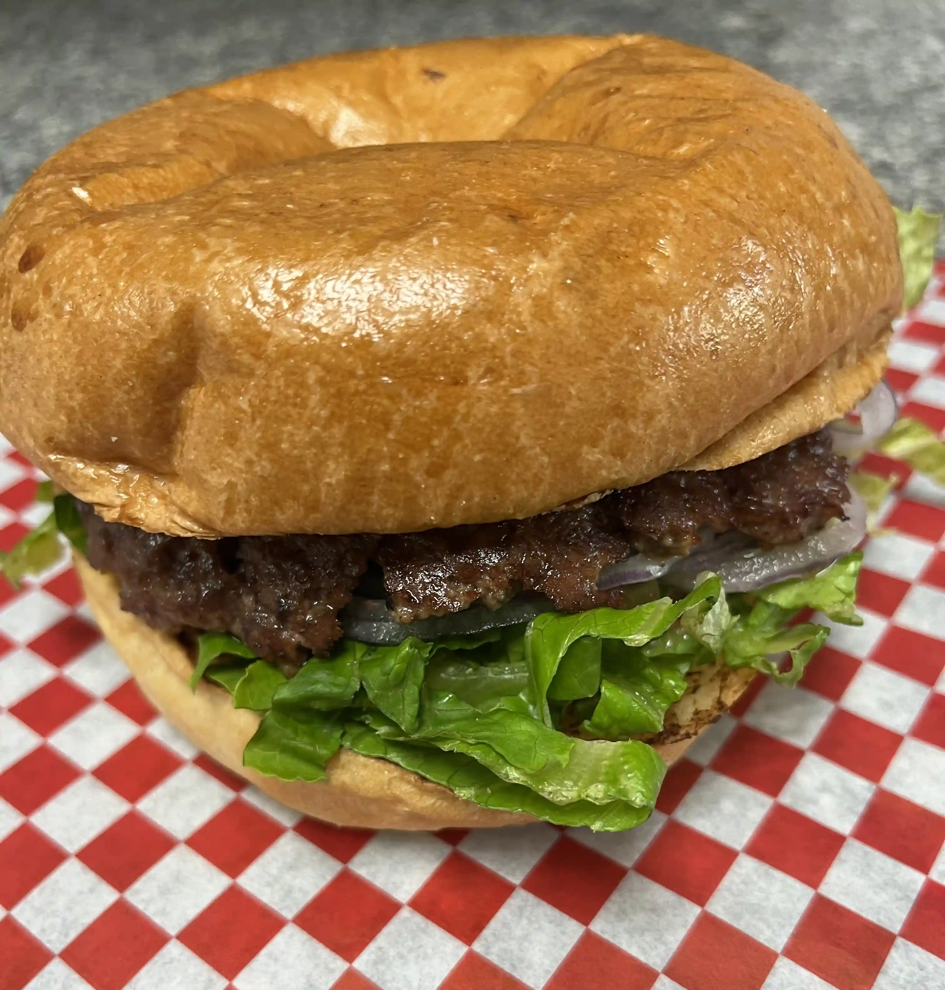 Beef angus, salad,tomatoes, onions,pickles,burger sauce