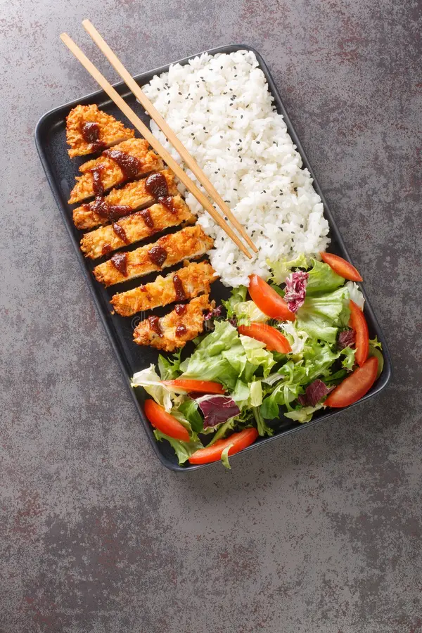 Katsu chicken, Chicken breast, Fried panko chicken breast, Teriyaki sauce, Spicy mayo sauce, Cives