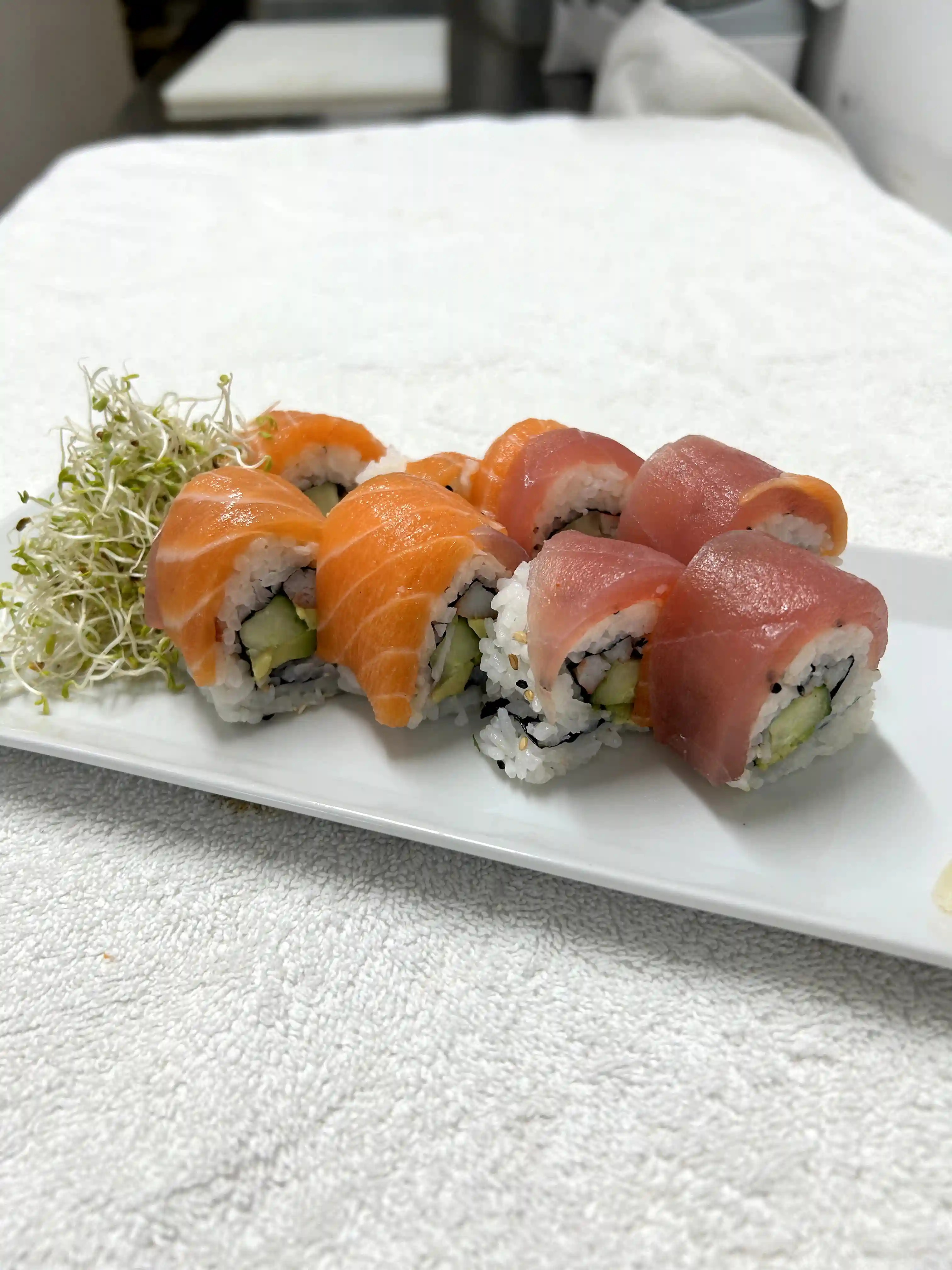 Riz, concombre, avocat, edamame, carotte, wakame, alfalfa