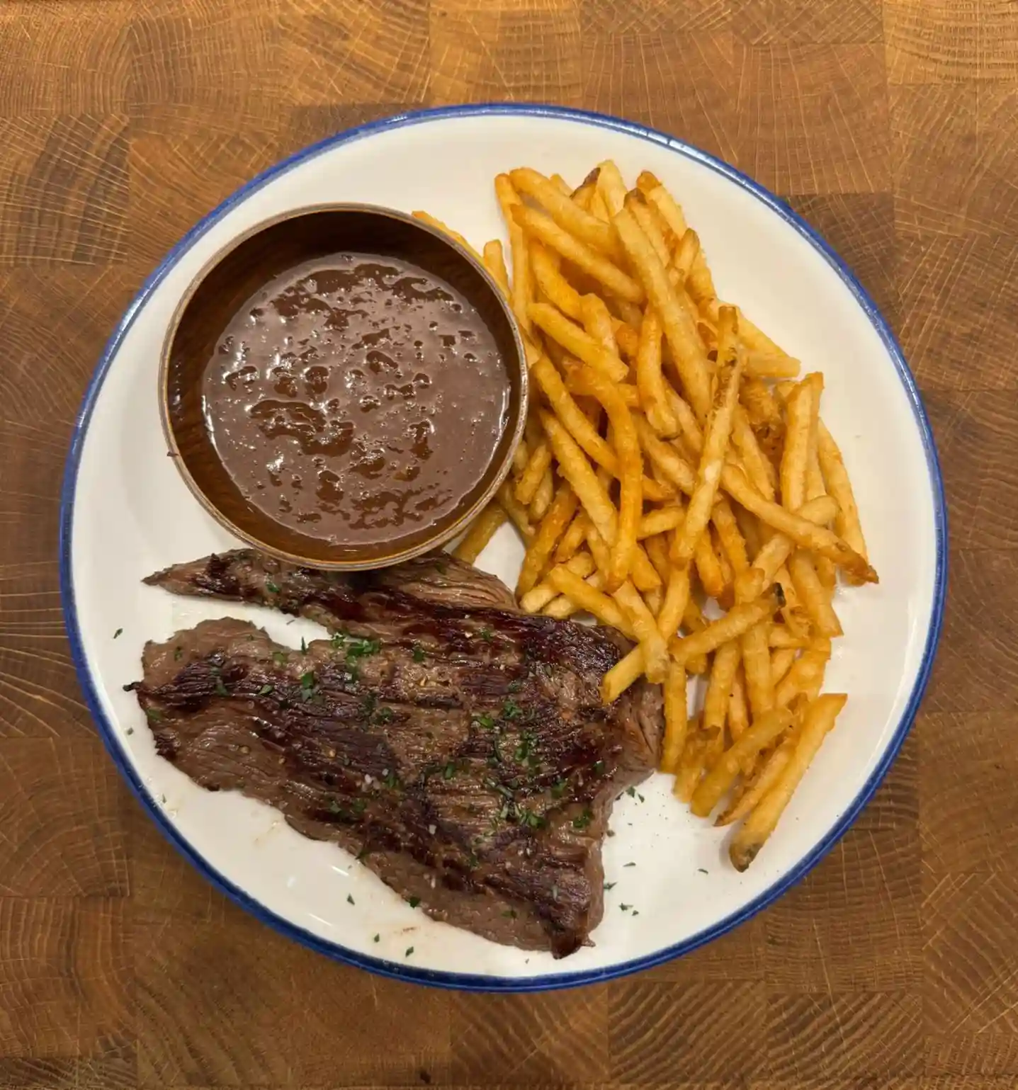 Steak, fromage à raclette, oignon confit, crème fraîche avec pommes de terre frappées ou salade verte